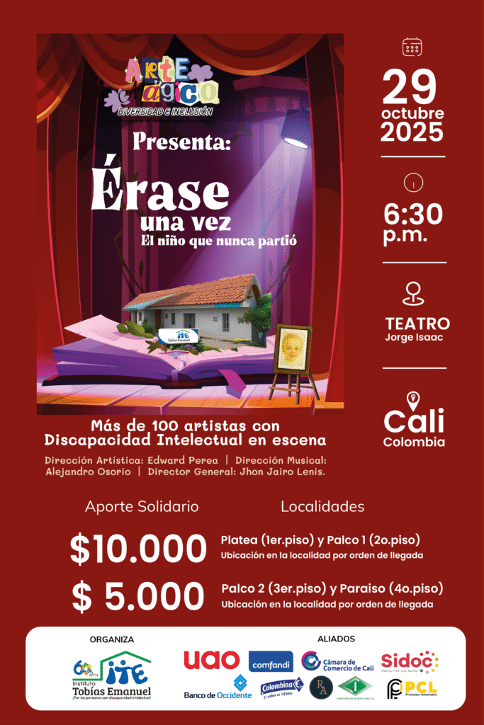 Arte Mágico. Es una muestra artística que reúne en escena a mas de 100 artístas con discapacidad intelectual expresando a través de la música, el baile y la actuación el alcance de sus capacidades bien enfocadas. Este encuentro se realizará el 29 de octubre en el Teatro Jorge Isaacs. Un espacio mágico que no puedes perderte